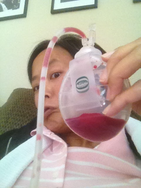 This is me, post-mastectomy, showing you what a drain looks like. Before my mastectomy, I heard the drains were everyone's least favorite part about all of this, and even my surgeon admitted to me that she found the drains disgusting, so of course I Googled 'drains after mastectomy' to try to see what all the hullabaloo was about. I'm including my own photos of drains in case you arrived here the same way. (It gets even better when big chunks start appearing.)